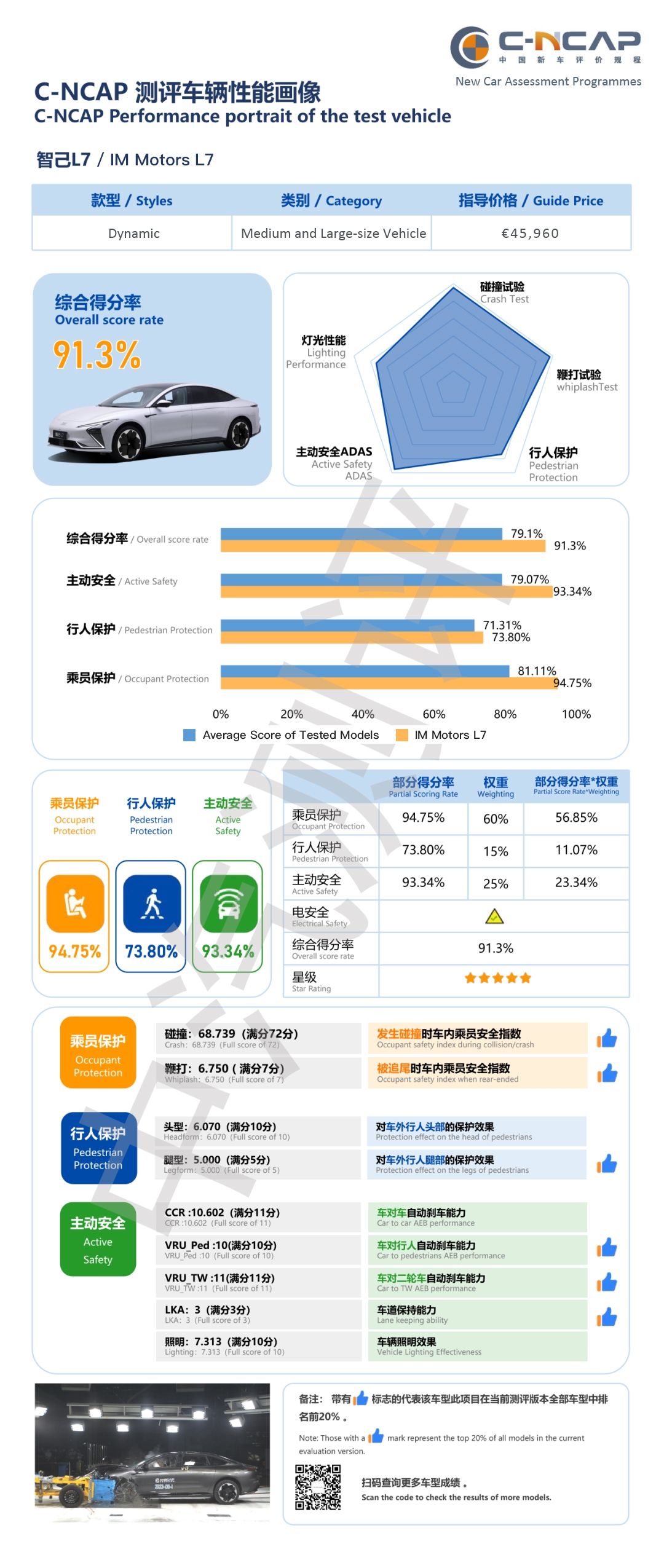 Recently, the China Automotive Technology & Research Center announced the test results of China's New Car Assessment Programs (C-NCAP), with the updated rating scheme for 2021, and IM Motors' L7 ranked first on the list. In the Occupant Protection segment, L7 scored 94.75%, which is the highest score in C-NCAP history. In the Active Safety ADAS segment, L7 scored 98.4%, creating the top performance record for new energy vehicles.
